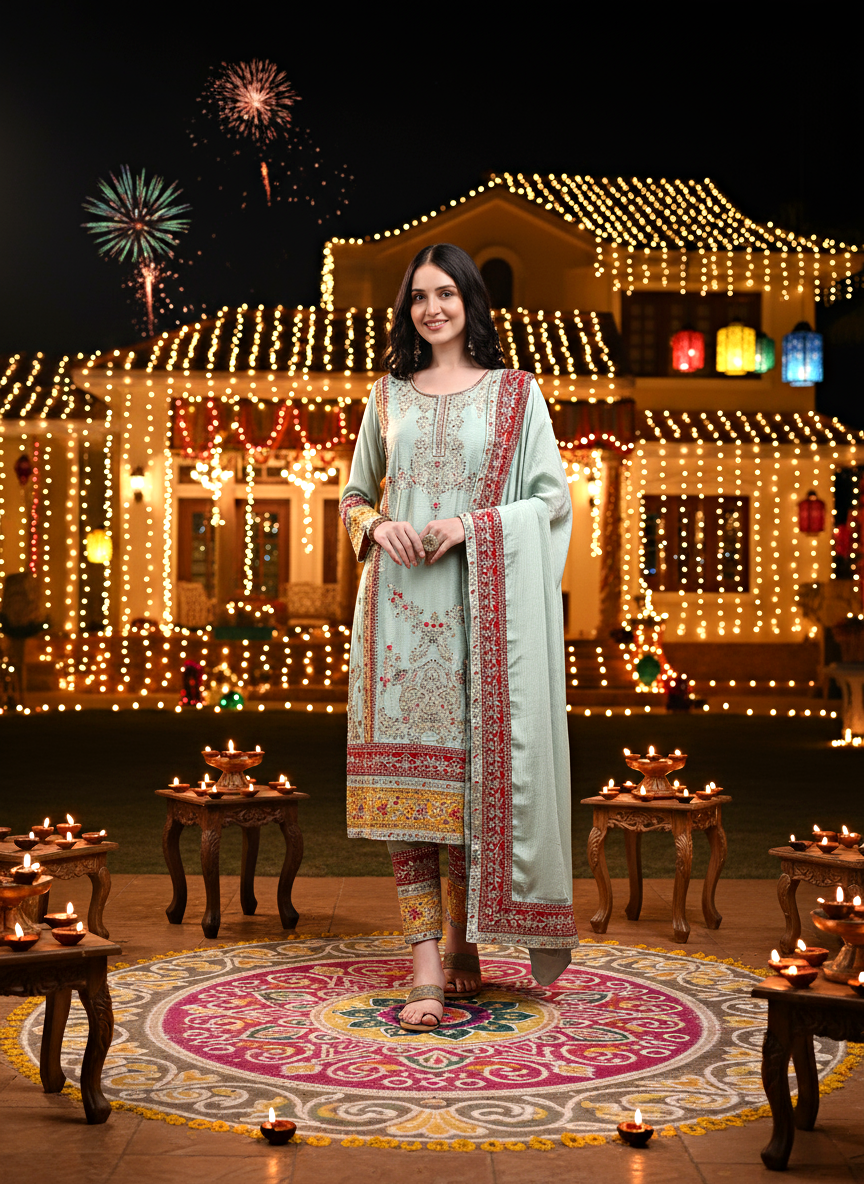 Grace meets tradition in this pastel green suit set, beautifully detailed with intricate embroidery in shades of red, yellow, and silver. The straight kurta is paired with printed embroidered pants and a matching dupatta, making it a perfect blend of sophistication and vibrant design. Ideal for festive gatherings, family functions, or cultural celebrations, this outfit ensures you stand out with charm.
